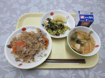 本日は、6年3組の献立でした。献立テーマは「あたたかい給食」です。お昼の放送では、献立を考えたグループの子ども達が献立紹介をしてくれました。豚丼と味噌汁で一気に体が温まり、満腹感でいっぱいになりました。また。献立に「ごま和え」を入れるところが渋いと思いました。1月26日(月)は6年5組のグループが考えた献立が給食に出されます。