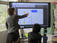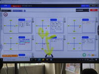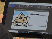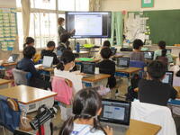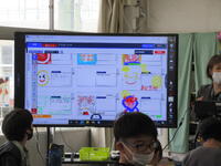 この日、4年生は「クラスのキャッチコピーとロゴマークを作ろう」という目標で、「オクリンク」と「ムーブノート」の操作の仕方を学習しました。はじめにキャッチコピーに使いたい言葉を「ムーブノート」に入力し、一人ひとりが「オクリンク」で送信しました。一人一人の画面は教室内の大型提示装置に一覧で映し出されます。自分が送信したデータを発見した子供たちからは歓声が上がっていました。送信された言葉はソフト内で即座に集計され、言葉の意味を示す座標に表示されました。続いて、「ムーブノート」にクラスのロゴマークを一人ひとりがデザインしました。子供たちは完成したデザインを再び「オクリンク」で送信し、大型画面に映し出されたデザインの一覧をみんなで観賞し合いました。