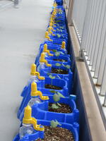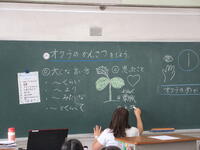 2年生が生活科の学習でオクラを育てています。一人一人の植木鉢に土と肥料を入れて、土づくりから始めました。種をまいた後、毎日自分で水やりを続けてきました。今日は育ってきた葉っぱの様子を詳しく観察し記録しました。みんなオクラができるのを楽しみにしていました。