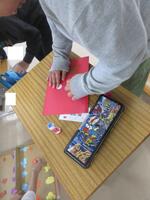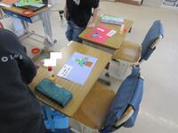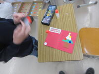 にじいろ学級での外国語活動の様子です。英語の単語や会話を交えながら、「クリスマスカード作り」を行いました。クリスマスツリーは緑(グリーン)の三角形(トライアングル)で作られており、三角形が何個あるか確認しながらクリスマスカード作りを行っていました。教師が、「ハウメニ トライアングル?」と質問し、子ども達と「ワン ツー スリー・・・・・・」と数え、ナイン(9枚)必要なことがわかりました。子ども達は、用意した色とりどりの丸や四角形、三角形、星、ハートの紙から、「レッドサークル プリーズ」「~プリーズ」と言って、自分の好きな形を選び、もらうと「サンキュウ」と返していました。楽しみながら英語を使い、オリジナルツリーも作れるので、みんなとても楽しそうに学習に取り組んでいました。