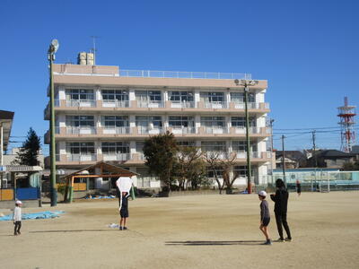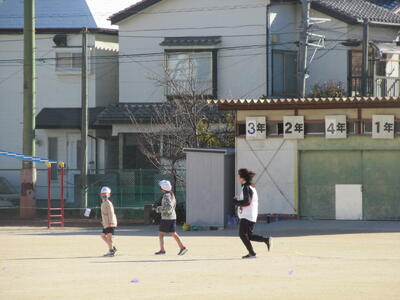 ひだまり学級の校庭での活動の様子です。一つのグループは、体育でトラックをゆっくり自分のペースで走っていました。もうひとグループは、凧あげをしていました。凧あげでは、協力して活動する姿が見られました。低学年のお友達が走り始めると、高学年のお兄さんが、凧をタイミングよくはなしてあげ、凧がうまく風を受けてあがっていました。