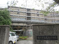 音楽室では管弦楽部が練習中でしたが、重たい防音扉を取り外し新しい扉への交換作業が行われました。A棟は足場とネットで覆われています。外壁工事は12月まで続きます。学校にお越しの際は、出入りする工事車両等に十分ご注意願います。