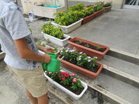 職員玄関前に並べられたプランターの花には、毎朝、当番の栽培委員が水やりを行い育てています。