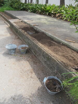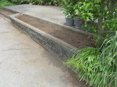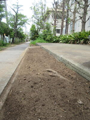 本校の正門前には、今は使われなくなった花壇が2つあります。毎朝、正門前に立って挨拶する時、いつも「あの花壇に花がいっぱい咲いていると、学校が明るくなる感じがするんだけどなあ」と思っていました。そこで、もう一度整備して、花を植えてみようかと思いました。花壇の整備をコツコツしながら、栽培委員会の子ども達に、花を選んでもらい、植えてほしいなあと考えています。きれいな花壇に変身するか不安ですが、花壇再生に向けて奮闘中です。
