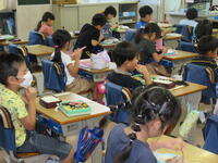 給食室の工事に伴い9月2日(金)~10月6日(木)まで、給食の提供ができないため、お弁当による昼食の時間がスタートしました。9時45分頃に搬入されたお弁当は、調理員の皆様により家庭科室に保管管理されました。その後、配膳室経由で各教室にお弁当が届きました。ご飯とおかずは別容器となっています。ご飯は低学年には少し多いくらいの量でした。残す場合は給食時の様に残菜を集めることはありません。容器にそのまま残して蓋をすることになっています。給食の時間は1学期までと同様に、感染予防対策上「黙食」でしたが、放送委員によるお昼の放送を聞きながら、マナーを守って食事をすすめる様子が見られました。また、お家から持参したお弁当は、保冷バックや保冷剤といった食中毒対策がなされていました。朝、お忙しい中でのお弁当作りとなりますが、約一か月間ご協力をよろしくお願いいたします。