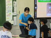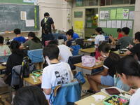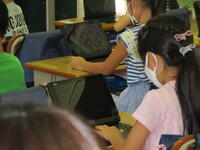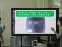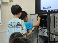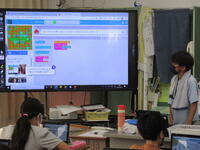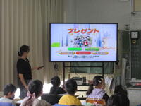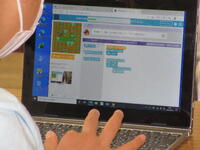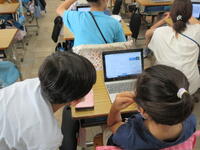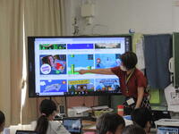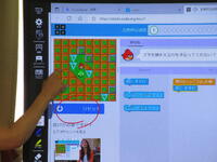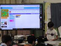 体験したソフトは、赤い鳥が緑のブタを捕まえるために、赤い鳥にどの様な動きをさせたらよいかプログラムを組み立てていくゲーム形式となっています。簡単なステージからスタートしましたが、複雑なプログラムの組み立てが必要なステージでは、挙手して支援員を呼んだり、友達同士で教え合いながら、子供たちは次々とステージをクリアしていきました。授業の後半では大型提示装置を使って、自分の組み立てたプログラムを説明しながら発表する児童も複数見られました。