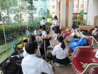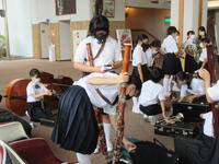 ホールに到着した部員達はホワイエにて各自で演奏の準備に取りかかりました。8月31日に習志野文化ホールでの練習を経験していることもあり、本番前ではありますがみんな落ち着いた様子で楽器の準備やチューニングを行っていました。TBS係員の方の誘導で2階のステージ袖に移動し前の団体の演奏を聴いている間も、緊張しすぎることなくリラックスしており、実力が発揮できそうな雰囲気を感じました。入場の前、顧問の佐々木教諭からの指示を聴いて、本番のステージへと向かいました。