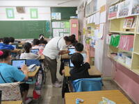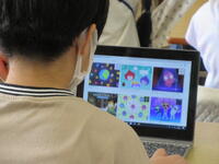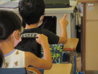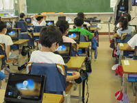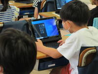 一人ひとりのタブレットは教室の保管庫で保管されています。まずは、担任の先生から自分のタブレットを受け取り自席に戻りました。電源の入れ方を教わり自分のモニターに壁紙画像が映ると歓声が上がりました。今回のめあては「IDとパスワードを入力してログインする」でした。少し長めのIDやパスワードを入力するのは1年生にとって簡単なことではありませんでしたが、ICT支援員の説明を聞いたり、手を挙げてヘルプを呼んだりしながら、全員がログインに成功しました。モニターに自分の名前が表示された時にはニコニコの笑顔になっていました。1年生が学習の場面で効果的に使いこなすには、時間が必要です。「未来タイム」の時間を活用しながらすすめていきます。