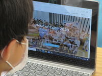 はじめに、ネット上の「Hour of code」というサイト内にある、プログラミング体験ソフトを各自のタブレットにダウンロードしました。支援員から「このサイトは世界で数十万人もの人々が使っています。はじめに表示言語を日本語にしましょう。」と指示がありました。