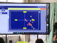 この日、4年生は「クラスのキャッチコピーとロゴマークを作ろう」という目標で、「オクリンク」と「ムーブノート」の操作の仕方を学習しました。はじめにキャッチコピーに使いたい言葉を「ムーブノート」に入力し、一人ひとりが「オクリンク」で送信しました。一人一人の画面は教室内の大型提示装置に一覧で映し出されます。自分が送信したデータを発見した子供たちからは歓声が上がっていました。送信された言葉はソフト内で即座に集計され、言葉の意味を示す座標に表示されました。続いて、「ムーブノート」にクラスのロゴマークを一人ひとりがデザインしました。子供たちは完成したデザインを再び「オクリンク」で送信し、大型画面に映し出されたデザインの一覧をみんなで観賞し合いました。