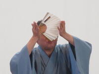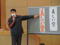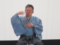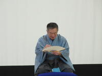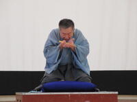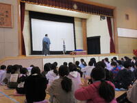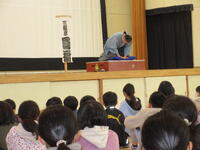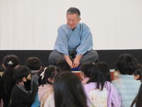 1月24日(火)に4年生を対象とした落語教室を行いました。落語教室は4年生国語科授業の一環としてコロナ渦以前は毎年開催していた体験学習です。今年は三遊亭円福師匠をお招きして久しぶりに開催することができました。 4年生が集合した体育館に、寄席の出囃子が流れる中、円福師匠が登場しました。はじめに、落語は何人もの登場人物を一人で演じること、「扇子」と「手ぬぐい」を使って様々な動作を演じるのが特徴であることを習いました。扇子を使って煙管を吸う仕草や、天秤棒を担いでやって来た蕎麦屋に入った客が蕎麦を食べる仕草の後には、自然と拍手が沸き起こりました。円福師匠の芸はまだまだ続きました。扇子を広げてお酒を飲んだり、手紙を読んだり。手ぬぐいを財布にしたり、焼き芋にしたり・・・ だんだんと落語家の面白さを感じてきた子供たちは、掛詞の説明や小噺を聞き始めると笑いはじめ、落語「牛褒め」「平林」では笑顔で大笑いしながら落語を楽しんでいました。休憩時間にはステージの師匠の元に自然に集まり、会話を楽しむ様子が見られました。