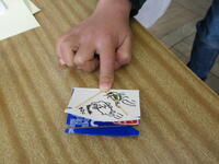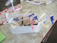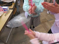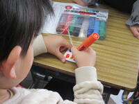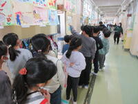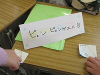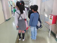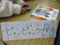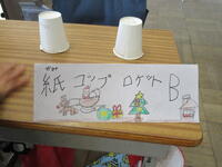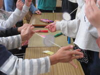 1年生は迎えに来た2年生と一緒に、活動場所である2年生の教室に向かいました。教室には体験するおもちゃごとにコーナーが作られていました。「ピョンピョンウサギ」「ピョンピョンカエル」「紙コップロケット」「ぶんぶんごま」「紙とんぼ」の5種類です。