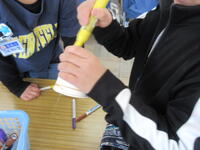1月12日(金)に1年生と2年生が交流活動を行いました。2年生が手作りしたおもちゃで一緒に遊びながら、おもちゃの作り方を教える時間です。