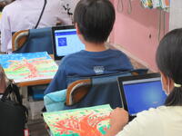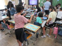 4年生図工の授業で完成した作品を「ミライシード」内の「オクリンク」を使って共有しました。校庭の樹木の絵を完成させていた子供たちは、タブレットで自分の作品を撮影しました。立ち上げていたタブレットで「ミライシード」を開き、写真データを「オクリンク」に送ると、教室の大型提示装置には送られてきた画像が次々と映し出されていきました。【学校経営方針との関わり】「確かな学力」ICT利活用の推進