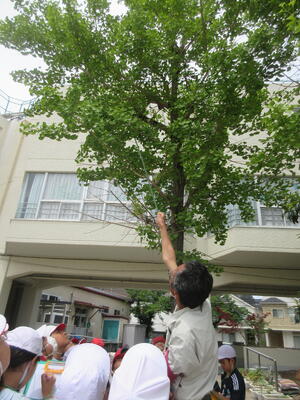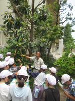 毎年、4年生は市川自然博物館の学芸員の方をお招きして,春と秋に自然観察教室を行っています。子ども達を前に講師の先生は「実物を見ることが大切」と話しているのが心に残りました。観察のスタートは職員玄関前のイチョウの木です。イチョウの木には雄雌があり、雌(めす)の木にだけ実がなり、中に種があることを話すと「銀杏?」と聞き返していました。隣のビワの木では黄色に実がたくさん生っていました。色づいた大きな実を見て「食べたいなあ」と口々に言っていました。隣の観察池にはヒキガエルの無数の黒いオタマジャクシが泳いでいました。鬼高小周辺に棲んでいる野生のヒキガエルにとってとても重要な池で3月になるとこの池を目指して、卵を産みに来るということを教えてもらいました。また、この池が無くなったら産卵場所がなくなるのでヒキガエルも滅んでしまう、という話も聞きました。ヒキガエルの寿命は10年くらいで、池では暮らさないことを教わると、みんな驚いていました。この後は、学校を取り囲む植物を移動しながら観察しました。カタバミ(植物)とヤマトシジミ(蝶)の関係、ムラサキツユクサ、梅、かしわばアジサイ、きのこ(かわらたけ)、さつき・・・・。学芸員さんの説明を受けながら、子ども達は聞き逃すまいと一生懸命にメモを取っていました。また、虫などを見つけると、講師の先生に聞きに行くと、すぐに教えてもらえるので子ども達も興味を持って観察していました。実物のものを見たり、触れたり、においをかいだりと目を輝かせて学習に取り組む姿を見て、体験活動の重要さを実感しました。