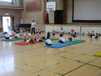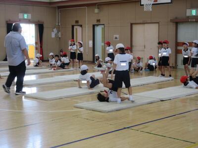 運動会、スポーツテストが終わり、今、体育の授業は水泳器械運動を中心に行っています。今日は2年生マット運動の様子です。内容は「マットを使った運動遊び」で、ったり腕で体を支えたりする運動を「遊び的な要素」を入れながら行っています。いろいろな動きを通して、体の感覚をいっぱいつかんでほしいと思います。