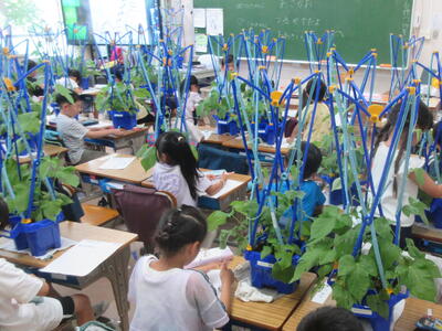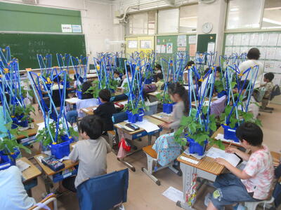約1か月前には小さな芽だった「あさがお」も、こんなに大きく成長しました。子ども達は自分の植木鉢を教室に持ち込んで大きく育ったあさがおをじっくり観察しました。つるやはっぱを触って感触を確認したり、目を近づけて葉の表や裏、つるの様子を観察したりと集中して、観察プリントにまとめていました。あさがおの観察はまだまだ続きますが、つぼみができ、が咲き、しぼみになっていく中で、子ども達がどんな発見をしていくのか楽しみです。