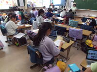3年生の図工では「すてきないきもの」の単元で絵をかいています。大きな画用紙に、白のクレヨンでそれぞれ生き物を描き、線以外のところに色を付けて作品を完成させていきます。子ども達の作品は大きく生き物が描かれておりダイナミックな作品が多かったです。色付けはいろいろな色をにじませて、その組み合わせで行っていきますが、色をにじませるとそのまま色を塗るよりも、味わい深いものとなります。今回は、自分の作品に貼る、作品カードをみんなで書いていましたが、それぞれ自分の思いを大切にしながら、題名や作品についての感想などを書き込んでいました。どの作品も、個性的で、私には芸術作品に思えるものばかりでした。