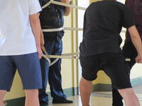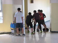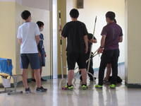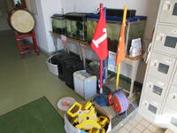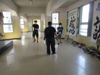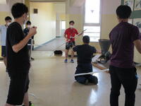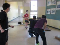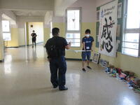 一方、あらかじめ直接不審者対応をとることになっていた男性職員は、B棟3階スカイギャラリーにて不審者を取り囲みました。今回不審者役を市川警察署の方にお願いしていましたので、職員が持参した刺股の扱い方や取り囲む際の留意点を詳しく指導いただくことができました。訓練終了後、凶器を所持した不審者は、無理に確保しようとすると危険であること。警察が到着するまで取り囲み、児童から引き離しておくこと。実際の場合は不審者の動きに応じて、教職員も児童も動く必要があるため、校内での情報共有が大切であるとお話しがありました。