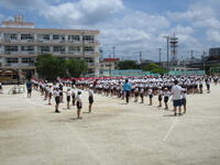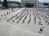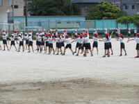 開会式では準備運動としてラジオ体操を行います。体操隊形に移動した後、前方に並ぶ運動委員が手本となり、ラジオ体操の練習を行いました。