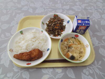 今日の献立:ごはん、牛乳、たらのたつたあげ、くきわかめの金平、かきたま汁