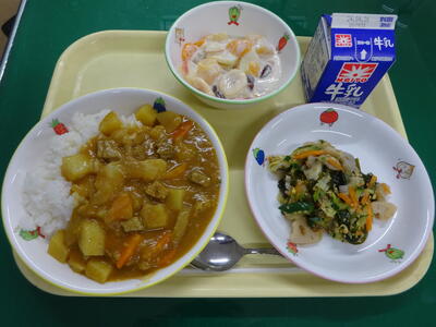 今日の献立:カレーライス、牛乳、海藻サラダ、ヨーグルトあえ