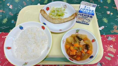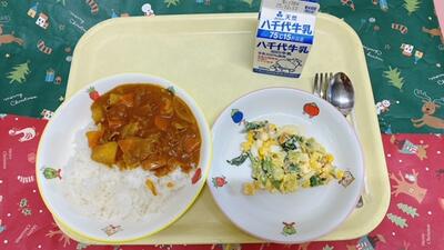 ごはん、カレー、いちかわのなし入り杏仁フルーツ、牛乳