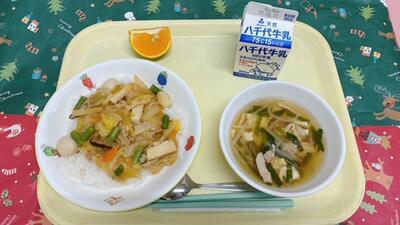 小松菜のあんかけ丼、中華風たまごスープ、ルルとララのクッキーの実、牛乳