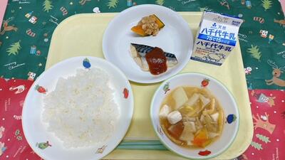 ごはん、サバの味噌煮、かぼちゃそぼろあんかけ、みそけんちん汁、牛乳