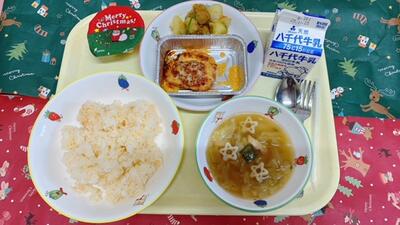 キャロットライス、鶏のミラノ風、カレーポテト、星のスープ、サンタさんの三色デザート、牛乳