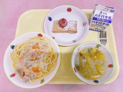 クリームスパゲティー、白菜スープ、いちごパイ、牛乳