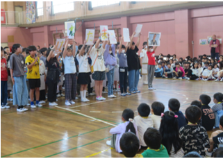 10月18日に体育館で読書集会が行われました。図書委員が本に関する〇×クイズを行ったり、クローバー劇場の皆さんによる「花さき山」の読み聞かせがありました。