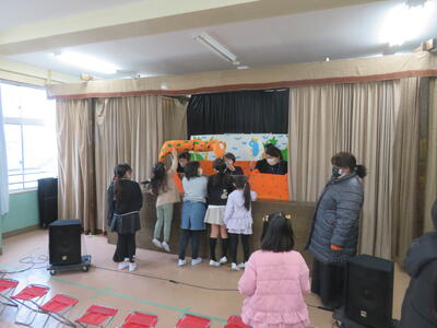 今年は体育館に6年生が居て、そこに各学年が出し物を発表しに行くという形式でした。