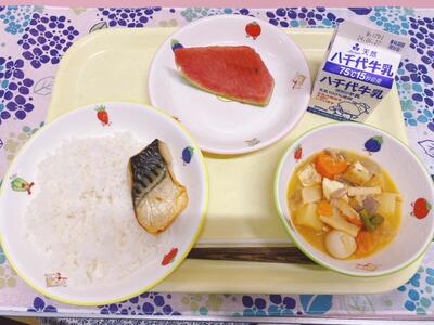 さつまいもごはん、ポコポコさつま揚げ、おひたし、じゃがいもとわかめの味噌汁、牛乳