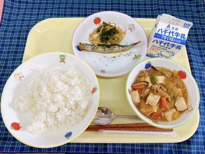 ごはん、五目豆腐、ししゃも磯焼き、ごま酢和え、牛乳