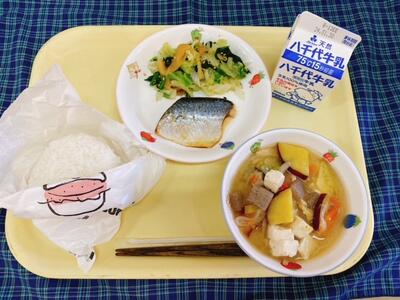 ごはん、豆腐ハンバーグ、ひき菜いり、のっぺい汁、牛乳