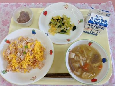 たけのこごはん、鰆のごまだれ焼き、おひたし、かきたま汁、カラマンダリン、牛乳