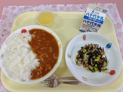 ひじきごはん、千草焼き、おかかあえ、新玉とわかめの味噌汁、きよみオレンジ、牛乳