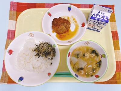 ごはん、行徳のりのりふりかけ、蓮のハンバーグ梨ソース、市川の味噌汁、牛乳