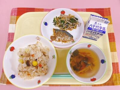 吹き寄せごはん、サバのごまだれ焼き、菊花和え、沢煮椀、牛乳