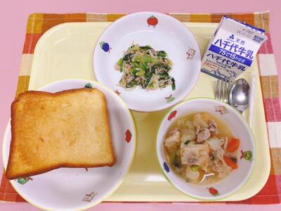 メープルバタートースト、洋風煮込み、小松菜とツナのサラダ、牛乳