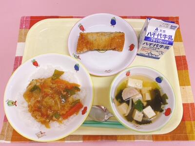 ホイコーロー丼、わかめスープ、ひじき春巻き、牛乳