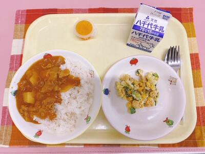 ごはん、厚揚げのカレー煮込み、みそポテト、花みかん、牛乳