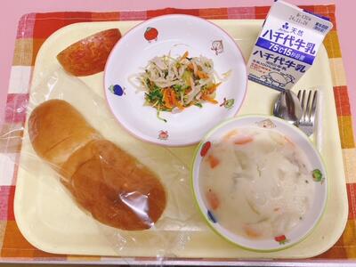 さつまいもパン、ホワイトシチュー、豆苗の中華風サラダ、りんご、牛乳