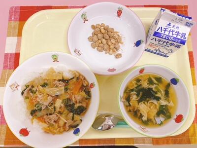 小松菜のあんかけ丼、たまごスープ、炒り大豆の黒砂糖がらめ、牛乳