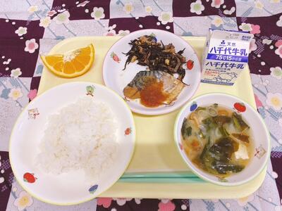 ごはん、サバのみぞれ煮、ひじきの炒め煮、なめこ味噌汁、いよかん、牛乳