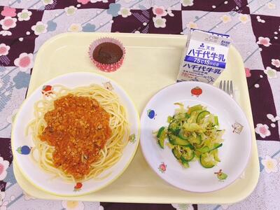 スパゲティー、ミートソース、ジャコサラダ、ガトーショコラ、牛乳