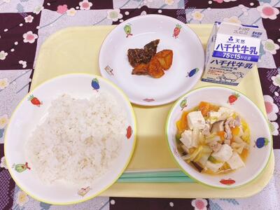 ごはん、豆腐ハンバーグ、れんこんきんぴら、のっぺい汁、牛乳