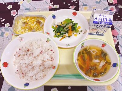 梅じゃこごはん、タラのタルタル焼き、友禅和え、沢煮椀、牛乳