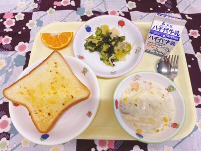 フルーツレモンのはちみつトースト、マカロニクリーム煮、わかめとこんにゃくのサラダ、はるみみかん、牛乳